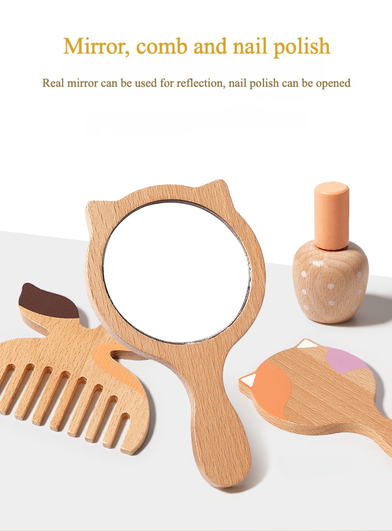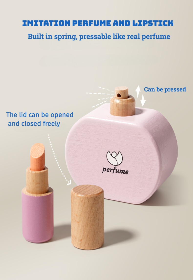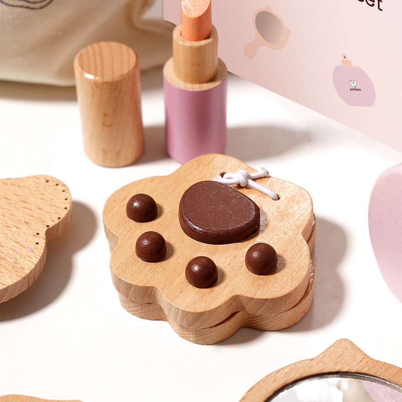 Thoughtfully crafted from solid, sustainable wood and painted with soft, water-based, non-toxic colors, this set includes a cosmetic box, mirror, perfume bottle, comb, lipstick, and more — everything a child needs for hours of gentle, imaginative play.
